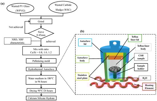 The synthesis of C-S-H from PV waste glass and carbide sludge proceeds in four main stages: pre-treatment, mixing and pelletizing, hydrothermal reaction, and post-treatment/characterization. First, equal masses of WPVG and WCS are co-ground in a ball mill (Retsch GmbH, Haan, Germany) until the resulting powder passes completely through a 0.45 mm sieve; material that fails to meet this criterion is returned to the mill. Once the desired particle size is attained, its chemical and phase composition are verified by XRD and XRF. The sieved powder is then slurried with deionized water at targeted Ca/Si molar ratios of 0.8; 1.0 and 1.2, and the homogeneous mixture is pressed into pellets using a standardized mold. These pellets are transferred to a hydrothermal autoclave (Zhengzhou Keda Machinery and Instrument Equipment Co., Ltd., Zhengzhou, China) and treated at 180°C for 96 h under autogenous steam pressure. Following the hydrothermal reaction, the pellets are dried at 90°C for 24 h to yield the C-S-H product. Finally, the synthesized C-S-H is characterized by XRD, FT-IR(Shimadzu Corporation, Kyoto, Japan), and SEM (Hitachi S-4800, Tokyo, Japan), as well as by functional groups, morphology, and elemental distribution. A flowchart for the process of synthesizing CSH is shown in Figure 1a. The hydrothermal autoclave used in the experiment is illustrated in Figure 1b.