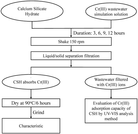 Cr(III) adsorption by the synthesized C-S-H was evaluated using simulated wastewater spiked with Cr(III) at a concentration of 8 g/L and a pH of 7.5. In each test, a fixed mass of dried C-S-H powder was dispersed in Cr(III)-containing solution at a predetermined solid-to-liquid ratio, and the pH was adjusted as required. The suspension was agitated on an orbital shaker at 150 rpm to ensure thorough contact between adsorbent and metal ions. After equilibrium was reached, the solid and liquid phases were separated by vacuum filtration. The filtrate was analyzed by UV-Vis (Shimadzu Corporation, Kyoto, Japan) spectrophotometry (300–800 nm), and Cr(III) concentration was quantified via a calibration curve to determine the amount of ion removed. Adsorption capacity was calculated from the difference between initial and equilibrium concentrations. The recovered C-S-H was then oven-dried at 90 °C for 12 h and subjected to SEM, EDX, FT-IR, and XRD analyses to reveal morphological, elemental, and structural changes associated with Cr(III) uptake. The process of Cr(III) removal is shown in Figure 2.