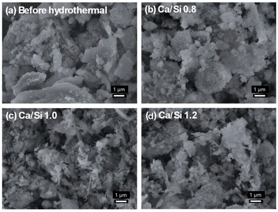 SEM images at 10,000× magnification: (a) pre-synthesis; (b–d) after hydrothermal treatment with WPVG and WCS at 180 °C/96 h and different molar ratios of Ca/Si: (b) 0.8; (c)1.0; and (d) 1.2.
