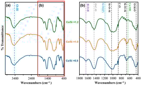 The FT-IR spectra of C-S-H samples (Figure 4a, 4000–400 cm−1) display a characteristic broad O-H stretching band centered at ~3400 cm−1, arising from interlayer and adsorbed water molecules [19]. Its full width at half-maximum decreases slightly as Ca/Si increases from 0.8 to 1.2, indicating a gradual loss of structurally bound water with rising calcium content. In the 1800–400 cm−1 region (Figure 4b), several diagnostic vibrations are resolved.