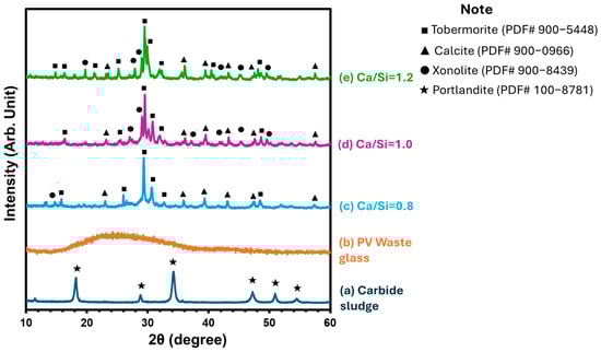XRD results of following samples: (a) carbide sludge; (b) PV waste glass; (c) Ca/Si = 0.8; (d) Ca/Si = 1.0; (e) hydrothermal product at Ca/Si = 1.2.