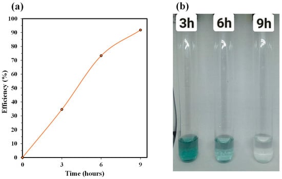 (a) Graph of Cr(III) adsorption efficiency of CSH mineral. (b) Simulated Cr(III) wastewater solutions at different adsorption times.