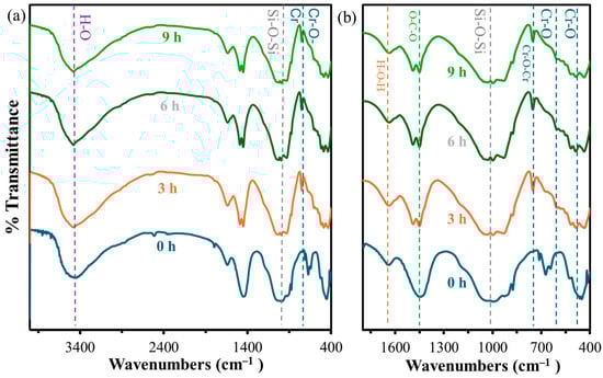 The results of FT-IR spectrum analysis of H2O-CSH before and after Cr(III) adsorption are shown in Figure 7a,b. The H2O-CSH after adsorbing Cr(III) still retains the characteristic bonds of CSH (Si-O-Si, O-C-O, O-H,…) in the wavenumber range of 400–1800 cm−1. In addition, new characteristic peaks appear in the FT-IR spectra of H2O-CSH materials after Cr(III) adsorption at 3, 6, and 9 h, including peaks characteristic of the symmetric elastic vibration of Cr-O-Cr at a wavenumber of ~750 cm−1 and the elastic vibration of Cr-O at wavenumbers in the range 480–620 cm−1 [22,23]. These new characteristic bonds also prove that Cr(III) after adsorption has formed bonds on the surface of CSH material.