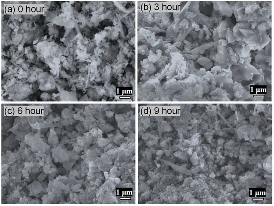 The SEM micrograph at 6 h (Figure 8c) reveals that the surface deposits have grown into discrete, nearly spherical nanoparticles (tens to hundreds of nanometers), which partially mask the underlying C-S-H morphology. These nodular aggregates are consistent with heterogeneous nucleation of Cr(OH)3 or mixed Cr-Si hydroxide phases on C-S-H surfaces, reflecting studies in which similar spherical Cr(III) precipitates have been reported [24].