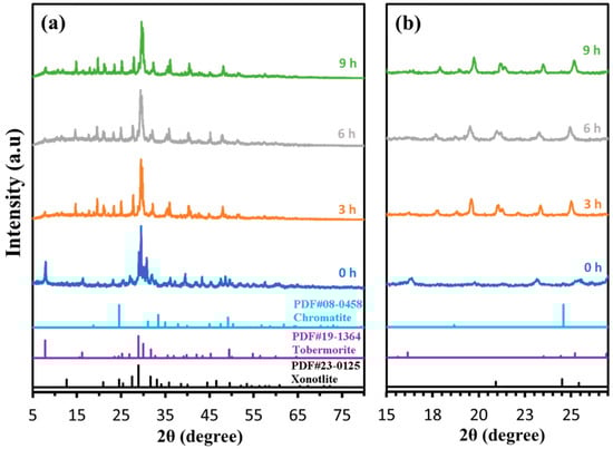 The wide-angle XRD patterns (Figure 9a, 2θ = 5–80°) of the Ca/Si = 1.0 C-S-H sample, before (0 h) and after Cr(III) adsorption (3, 6, and 9 h), consistently display the diagnostic reflections of tobermorite (PDF #900-5448) and xonotlite (PDF #900-8439). The major tobermorite peaks near 2θ ≈ 16°, 26°, 30° and 48°, and the xonotlite peak at ≈ 13°, remain visible at all contact times, confirming that the underlying C-S-H crystal framework is preserved throughout adsorption.