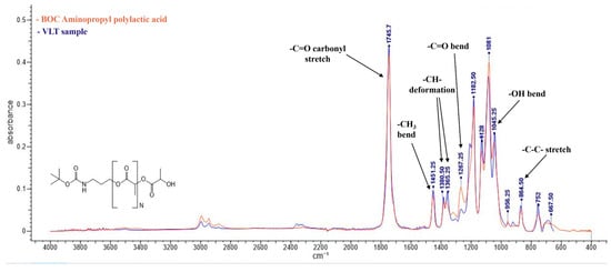 Figure 1 shows the IR spectrum of the VLT sample (blue) and the IR spectrum of the first entry in the IR spectral libraries (PLA, in red) overlapped. Characteristic bands of PLA [25] present in the spectrum of the VLT sample are indicated. The IR spectrum of the other sample can be seen in Figure S1 (Supplementary Materials).