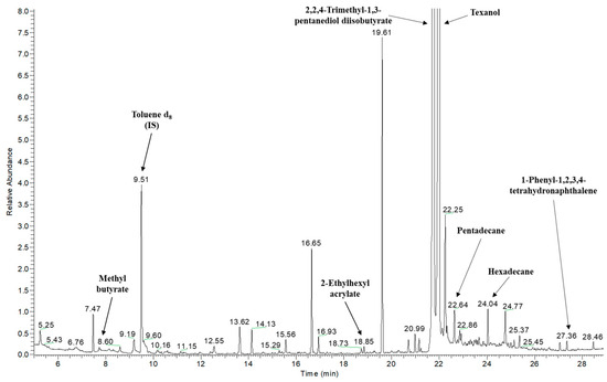 Toluene-d8 (≥99%) (CAS-No: 2037-26-5), provided by Sigma-Aldrich (Schnelldorf, Germany), was used as the internal standard for the P&T method, while diethyl phthalate-3,4,5,6-d4 (DEP-d, 99,3%) (CAS-No: 93951-87-2), purchased from Fluka (Steinheim, Germany), was used as the internal standard for the determination of semi-volatile compounds.
