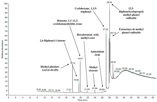 Figure 3 shows the GC-MS chromatogram of the VCT sample, showing the tentative identification of several peaks. Only 19 of the total compounds tentatively identified are included in the list of substances allowed by Regulation (EU) 10/2011 [11].