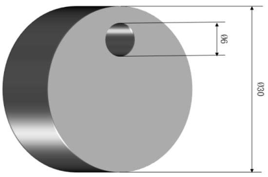 The test material consisted of 38CrMoAl steel, which was subjected to heat treatment involving quenching at 940 °C for 1 h (oil cooling), followed by tempering at 650 °C for 30 min (oil cooling). The specimen dimensions were Φ30 mm × 15 mm, and the chemical composition is presented in Table 1. After being ground using a metallographic grinding machine, the sample exhibited a mirror-like surface, as illustrated in Figure 1.