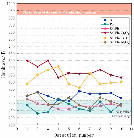 Three to four measurement points were selected in the upper, middle, and lower regions of the sample surface coated with the specified formula to determine the hardness values. The obtained hardness data are presented in Figure 5. The uniformity of the coating’s anti-nitriding performance was assessed based on the variation in hardness values across different regions. Formula 1 is a commonly used formulation in industrial applications and served as a benchmark for comparison. After nitriding, the hardness of the 38CrMoAl steel coated with Formulas 1–3 ranged from 314 to 378 HV, 228 to 340 HV, and 272 to 298 HV, respectively. These results suggest that lead powder has a superior anti-nitriding effect compared to tin powder. The hardness of the 38CrMoAl steel coated with Formula 4 was marginally higher compared to the previous formulations, with values ranging from 481 HV to 600 HV. For Formula 5, the hardness decreased slightly and fluctuated within the range of 436–558 HV. Among the several oxide-containing coating formulations, the anti-nitriding performance of Formula 6 was found to be the highest: the hardness values of the samples ranged from 263 HV to 376 HV, closely resembling those of the samples coated with Formula 1. Table 3 shows the average hardness values obtained from the measurements. 38CrMoAl steel is typically subjected to quenching and tempering treatment to achieve a uniform microstructure and excellent comprehensive mechanical properties. As a result, its hardness is generally controlled within the range of 220–320 HV. After nitriding, its hardness typically increases to above 920 HV [,]. From the hardness results, it was evident that anti-nitriding coatings composed of tin powder, lead powder, and various oxides effectively suppressed the increase in hardness and demonstrated a certain degree of nitriding prevention capability. However, only Formulas 2, 3, and 6 were deemed suitable for anti-nitriding operations, as their sample hardness values closely resembled those prior to nitriding. Based on the metallographic analysis presented earlier, the surfaces of Formulas 3 and 6 were similar to those of Formula 1, indicating similarities in their surface microstructures. Furthermore, the hardness values of Formulas 2, 3, and 6 were all lower than that of Formula 1, suggesting that these three formulas exhibit superior performance and are more suitable for anti-nitriding applications. Compared with Formula 1, the formulations containing chromium oxide and copper oxide resulted in inferior hardness values. Although these formulations had a certain anti-nitriding effect, their relatively high hardness renders them unsuitable for practical production processes.