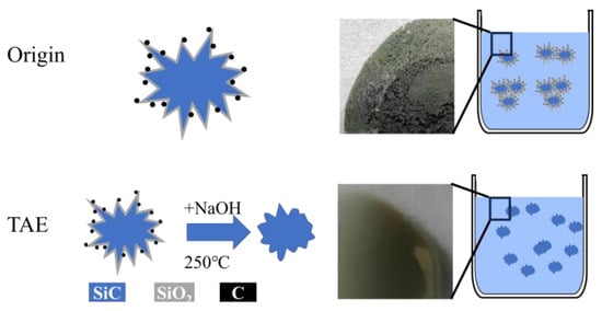 The precursor mixture with a weight ratio of SiC:NaOH:H2O = 1:0.5:5 underwent magnetic stirring (200 rpm, 25 °C, 30 min). Subsequent thermal treatment included sequential drying at 100 °C (2 h) and calcination at 250 °C (2 h) in a muffle furnace. Residual NaOH was eliminated through centrifugal washing (5 cycles × 10 min, 4500 rpm) until the supernatant reached pH < 8.