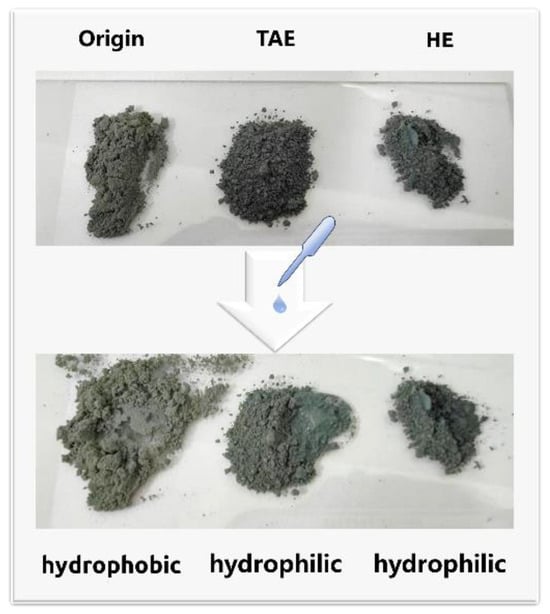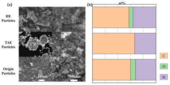 Figure 5a presents the SEM micrographs of Origin-SiC, HE-SiC, and TAE-SiC, all exhibiting polyhedral morphologies with comparable size distributions (50–200 nm). EDS quantification (Figure 5b) was detected ~15 at% oxygen in Origin-SiC and HE-SiC, confirming residual surface oxides. TAE-SiC exhibited near-complete oxide removal, verifying successful deoxidation via thermal activation. Despite the theoretical Si:C stoichiometric atomic ratio (1:1), all particles showed carbon enrichment (58–68 at% C vs. 32–38 at% Si), indicative of graphitic residues from SiC synthesis. TAE-SiC processing did not reduce the carbon content, confirming its inability to eliminate carbonaceous contaminants. The observed hydrophilicity enhancement primarily originated from oxide removal rather than carbon reduction, as surface hydroxyl groups from residual oxides impede water wettability.
