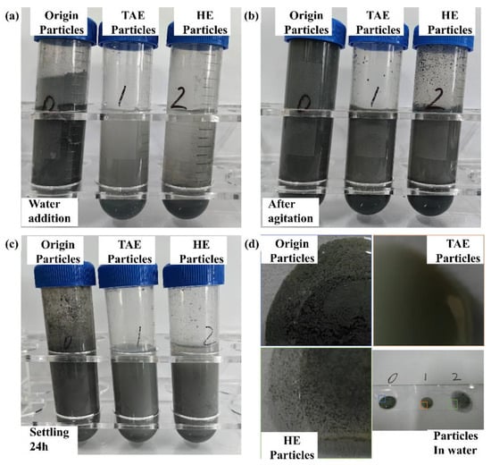 The enhanced dispersion stability of TAE-SiC stems from the following synergistic mechanisms: (1) a reduced particle mass (<300 nm) minimizes gravitational settling, and (2) an elevated surface charge (−25 mV) maximizes electrostatic repulsion through extended Derjaguin–Landau–Verwey–Overbeek (DLVO) interactions. Conversely, Origin particles’ paradoxical stability arises from hydrophobic surface-induced air encapsulation during agitation, generating buoyant hollow microclusters stabilized by Laplace pressure (Figure 3d). This micromechanical stabilization mechanism compensates for their unfavorable electrokinetic profile.