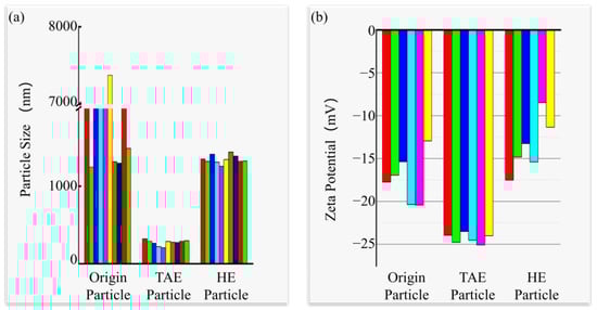 The zeta potential and particle size distribution of the suspensions were systematically characterized using a zeta potential analyzer (Table 1 and Figure 4; the colors in the bar graphs represent distinct measurement batches for visual differentiation, without additional significance). Size distribution analysis (Figure 4a) revealed that untreated particles (Origin) formed polydisperse clusters (>1 μm), while HE-SiC particles showed monodisperse aggregates averaging 1.3 μm. TAE-SiC yielded nanoparticles with a mean hydrodynamic diameter of 300 nm (sub-optical resolution), producing visually homogeneous suspensions, as corroborated by macroscopic observations in Figure 3. Zeta potential measurements (Figure 4b) demonstrated a superior electrochemical stability for TAE-SiC (−25 mV), contrasting with the lower potentials of Origin-SiC (−15 mV) and HE-SiC (−15 mV).