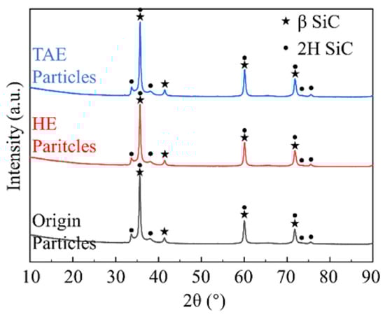 The X-ray diffraction analysis of the three particle types (Figure 6) revealed well-defined peaks matching β-SiC reference patterns. All samples exhibited characteristic β-SiC diffraction peaks at 35.7° (111), 60.0° (220), 71.8° (311), and 75.5° (222) 2θ. TAE-SiC showed sharper (111) and (311) diffraction peaks compared to the Origin-SiC and HE-SiC variants (Figure 6), indicating enhanced crystallinity through thermal activation. Broad scattering features between 20 and 30° 2θ were observed in Origin-SiC and HE-SiC (Figure 6 inset), suggesting residual amorphous Si-O surface species. The absence of amorphous scattering signals in TAE-SiC’s XRD profiles confirms effective oxide removal via alkaline calcination, directly correlating with their improved hydrophilicity (as demonstrated in Figure 3).