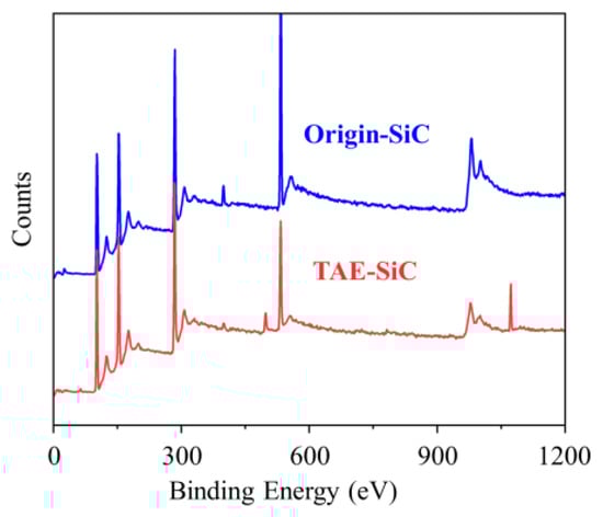 XPS wide-scan survey spectrum for Origin-SiC and TAE-SiC.