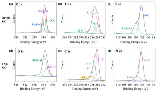 High-energy resolution spectrum for the O-1s (a), C-1s (b), and Si2p (c) signals of Origin-SiC and the corresponding spectrum for such signals of TAE-SiC (d–f).