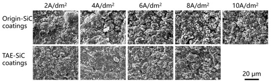 SEM of TAE-SiC- and Origin-SiC-enhanced coatings fabricated at varied current densities (2–10 A/dm2).