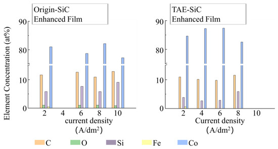 As shown in Figure 10, energy-dispersive X-ray spectroscopy (EDS) revealed oxygen contamination (~1 at%) in coatings containing Origin-SiC, whereas TAE-SiC-enhanced coatings exhibited no detectable oxygen (<0.01 at%). However, TAE-SiC-enhanced coatings displayed a 34% reduction in silicon content (3.83 at% vs. 5.82 at% for Origin particles at 2 A/dm2), indicating lower SiC incorporation efficiency. This discrepancy correlates with zeta potential measurements—TAE-SiC exhibited enhanced surface charge (−25 mV) compared to Origin-SiC (−15 mV), generating a stronger electrostatic repulsion within the electric field. Consequently, TAE-SiC migrated away from the cathode during electrodeposition, reducing near-electrode particle concentration by ~30% and diminishing co-deposition efficiency. At current densities exceeding 4 A/dm2, rapid cobalt deposition (0.56 μm/min at 4A/dm2; 1.24 μm/min at 8 A/dm2) outpriced particle migration, enabling the hydrodynamic entrapment of TAE-SiC near the cathode. This resulted in a 120% increase in SiC content (5.9 at% at 8 A/dm2; 2.68 at% at 4 A/dm2), as metallic encapsulation overrode electrostatic effects.