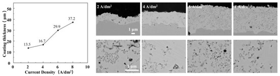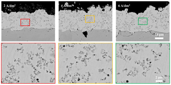 In contrast, Figure 12 shows untreated (Origin-SiC) particles’ distribution in coatings deposited under various parameters (2 A/dm2 for 1 h; 4–8 A/dm2 for 0.5 h each). The untreated particles demonstrate current density-independent embedment behavior, with uniform distribution across tested conditions. This fundamental difference highlights the critical role of surface activation in achieving current-responsive particle incorporation behavior.