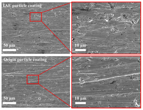 Figure 13 presents comparative surface topographies of TAE-SiC- and Origin-SiC-enhanced coatings after standardized tribological testing. Nanoscale reinforcements exhibit distinct wear characteristics compared to micron-sized analogs, with grain refinement correlating to more continuous abrasion grooves that are consistent with micro-plowing mechanisms. TAE-SiC-enhanced coatings show shorter average scratch lengths relative to untreated specimens, as measured from three SEM fields per sample. Surface morphological analysis reveals enhanced hook-shaped furrow formation in TAE-SiC-enhanced coatings, potentially indicative of interacting adhesive–abrasive mechanisms. While the recorded mass losses under ASTM G65 Method E conditions show minimal difference (1.6923 ± 0.0035 g vs. 1.7107 ± 0.0062 g), with corresponding wear rates of (2.037 ± 0.004) × 103 mm3/(N·m) vs. (2.059 ± 0.007) × 103 mm3/(N·m), repeated trials with larger sample sizes are recommended to confirm this trend. Notably, oxygen content variations between treated and untreated particles suggest that surface chemistry may mediate these wear responses, though direct causalities remain to be established.