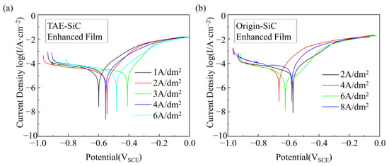 Tafel curves of the coating that was immersed in neutral 3.5 wt.% NaCl solution. (a) TAE-SiC-enhanced film; (b) Origin-SiC-enhanced film.