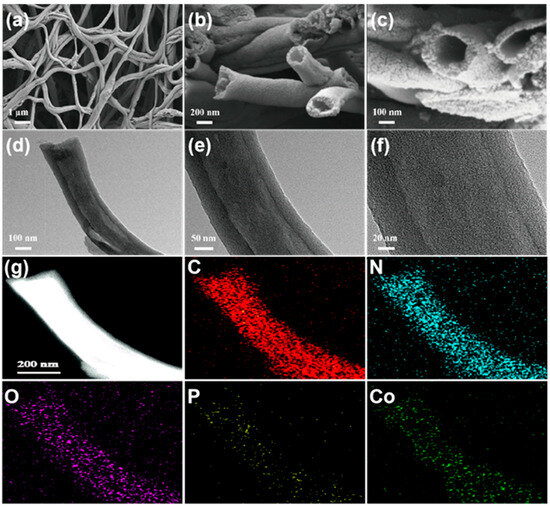 The morphology and microstructure of the synthesized samples were systematically characterized. Scanning electron microscopy (SEM) was employed to analyze the fibrous structure of the as-prepared Co/Co2P-NCNFs-H, as illustrated in Figure 1a. The SEM images revealed a tightly interwoven three-dimensional network of nanofibers, ensuring continuous conductive pathways. The fibers exhibited uniform diameters ranging from 200 to 250 nm, with submicron-scale dimensions contributing to their exceptional mechanical strength [51]. Cross-sectional SEM images (Figure 1b,c) confirmed the hollow architecture, attributed to the thermal decomposition of the polymethyl methacrylate (PMMA) core and the phase separation between PMMA and polyacrylonitrile (PAN). The removal of PMMA during carbonization exposed abundant active sites, thereby enhancing catalytic performance. The dual presence of PAN in both inner and outer layers facilitated robust integration of active sites with the carbon shell, effectively preventing metal particle detachment and ensuring structural stability. Notably, the fibers displayed no observable agglomeration, with wall thicknesses uniformly maintained at 30–50 nm. The self-supporting, three-dimensional network of nanofibers provides continuous pathways for electron transport and ensures robust mechanical integrity. Critically, the hollow interior of each nanofiber is intentionally designed to create channels that facilitate rapid electrolyte diffusion to the active sites and efficient release of generated gas bubbles (O2 and H2). This structure increases the overall specific surface area, thereby maximizing the exposure of catalytically active sites [41].