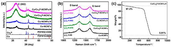 Composition study of the samples. (a) XRD patterns and (b) Raman spectra of Co-NCNFs, Co/Co2P-NCNFs, Co-NCNFs-H, and Co/Co2P-NCNFs-H. (c) TGA analysis of Co/Co2P-NCNFs-H.