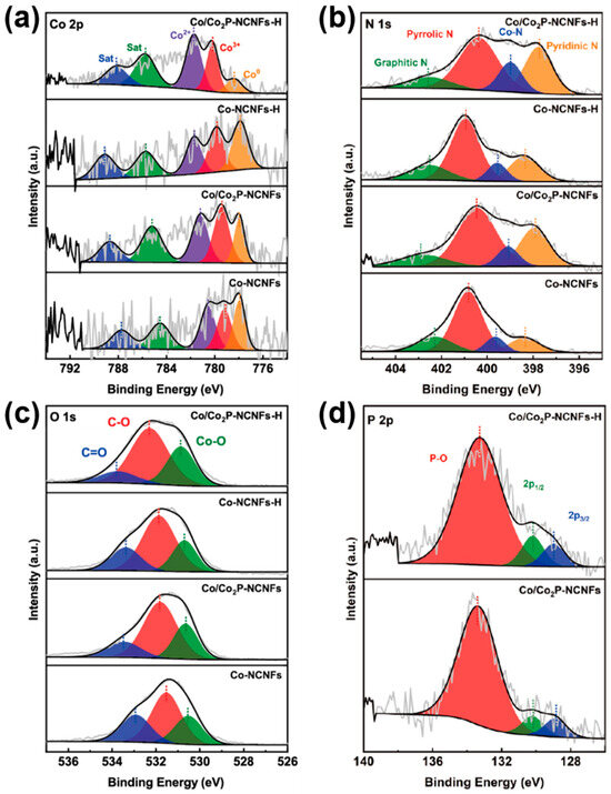 Meanwhile, Raman spectroscopy was employed to probe the structural characteristics and defect states of the carbon nanofiber framework (Figure 2b). All samples exhibit two prominent peaks: the D band at ~1350 cm−1, attributed to disordered carbon or defects, and the G band at ~1587 cm−1, corresponding to graphitized carbon atoms [56]. The ratio of the D band to the G band (ID/IG) is used to determine the degree of graphitization and defectiveness of carbon materials. For Co/Co2P-NCNFs-H, the ID/IG ratio was found to be 1.052, which is significantly higher than that of Co-NCNFs (0.96), Co/Co2P-NCNFs (0.978), and Co-NCNFs-H (0.982). This increase reflects N and P doping and hollow structure lead to a large number of defects in the carbon nanofibers. These defects play a crucial role in enhancing electrocatalytic activity by increasing the number of active sites and facilitating electron transfer across the carbon network [57]. Moreover, the higher ID/IG ratio is consistent with the XPS evidence of increased Co–N bonding and oxygenated functional groups (Figure 3b), suggesting synergistic modulation of the electronic structure through heteroatom doping and interface engineering.