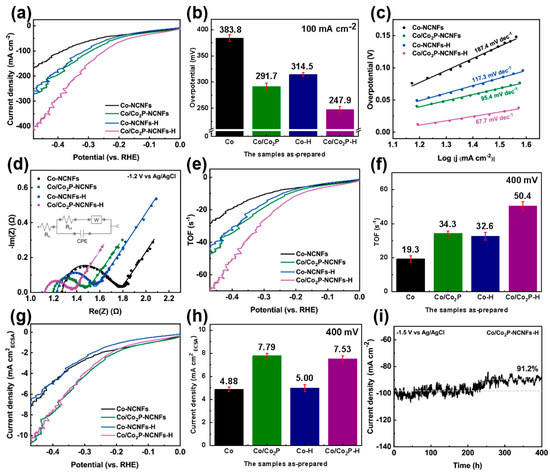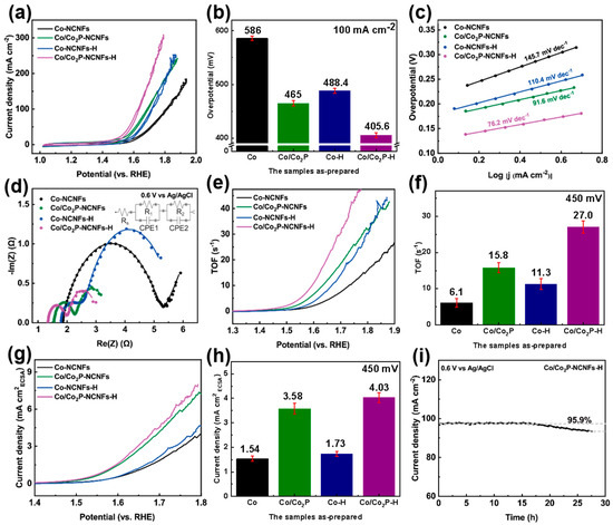 OER activity of the samples. (a) OER CV curves, (b) OER overpotential at 100 mA cm−2, (c) OER Tafel slopes, (d) Nyquist plots of OER in 1.0 M KOH, (e) TOF curves, (f) TOF values at an overpotential of 450 mV, (g) OER jECSA curves, (h) jECSA at an overpotential of 450 mV for Co-NCNFs, Co/Co2P-NCNFs, Co-NCNFs-H, and Co/Co2P-NCNFs-H in the OER test in 1.0 M KOH. (i) Chronoamperometry curve of Co/Co2P-NCNFs-H tested at a constant potential of 0.6 V vs. Ag/AgCl in 1.0 M KOH.