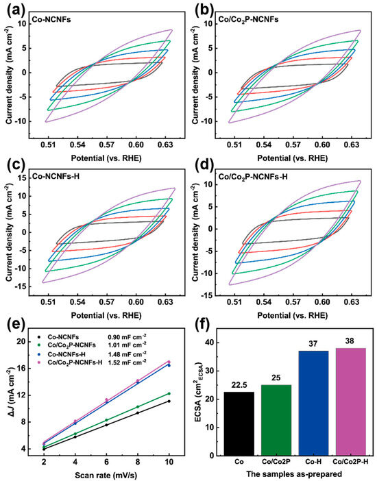 ECSA tests of the samples. CV curves of (a) Co-NCNFs, (b) Co/Co2P-NCNFs, (c) Co-NCNFs-H, and (d) Co/Co2P-NCNFs-H at different scan rates of 20, 40, 60, 80, and 100 mV s−1; (e) double-layer capacitance measurements and (f) ECSA of Co-NCNFs, Co/Co2P-NCNFs, Co-NCNFs-H, and Co/Co2P-NCNFs-H.