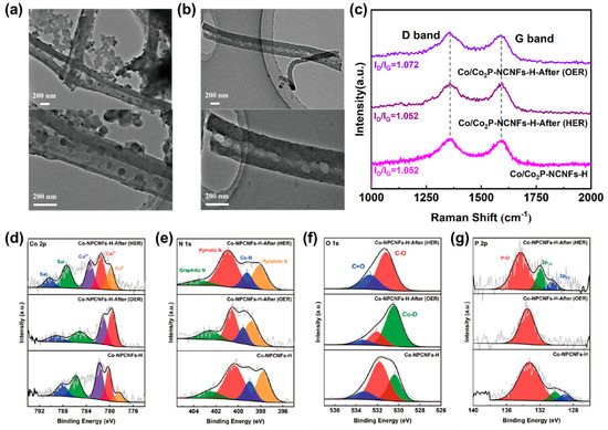 Structural stability during electrocatalysis. (a) TEM images of Co/Co2P-NCNFs-H-After (OER). (b) TEM images of Co/Co2P-NCNFs-H-After (HER). (c) Raman, (d) Co 2p XPS, (e) N 1s XPS, (f) O 1s XPS, and (g) P 2p XPS spectra of Co/Co2P-NCNFs-H-After (OER) and Co/Co2P-NCNFs-H-After (HER).