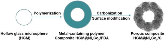 Initially, commercial iM16-type hollow glass microspheres (HGMs) were dispersed in 20 mL of 1 mol/L NaOH solution and subjected to ultrasonic treatment for 10 min to remove surface impurities and introduce hydroxyl groups. The HGMs were then thoroughly washed with deionized water until a neutral pH was reached, followed by drying to yield hydroxyl-functionalized HGMs. Subsequently, 0.5 g of the treated microspheres was mixed with specific volumes of 10.5 mmol/L NiCl2 and 10.5 mmol/L CoCl2 aqueous solutions. After thorough mixing, the pH of the mixture was adjusted to 8.5 using 10 mmol/L Tris buffer. A dopamine solution (20 mL, 1 mmol/L) was then added, and the mixture was stirred under ambient air for 24 h to promote the oxidative polymerization of dopamine catalyzed by the transition metal ions, yielding HGM@ NixCoy/PDA precursors (see Table 1 for specific compositions). The resulting solids were collected by centrifugation and freeze dried. Finally, the HGM@NixCoy/PDA powders were pyrolyzed at 800 °C for 3 h (heating rate: 5 °C/min) under an argon atmosphere (flow rate: 50 °C/min) in a tubular furnace to obtain the final HGM@ NixCoy/C composite materials. A schematic of the synthesis procedure is provided in Figure 1.