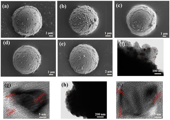 SEM images of (a) HGM@Ni1Co4/C, (b) HGM@Ni2Co3/C, (c) HGM@Ni1Co1/C, (d) HGM@Ni3Co2/C, (e) HGM@Ni4Co1/C, (f,g) TEM image of HGM@Ni2Co3/C, (h,i)TEM image of HGM@Ni1Co1/C.
