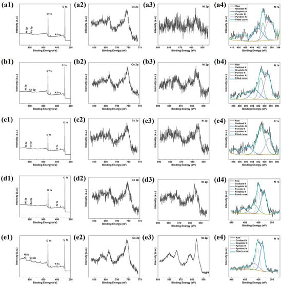 XPS spectra of (a1–a4) HGM@Ni1Co4/C, (b1–b4) HGM@Ni2Co3/C, (c1–c4) HGM@Ni1Co1/C, (d1–d4) HGM@Ni3Co2/C, (e1–e4) HGM@Ni4Co1/C.