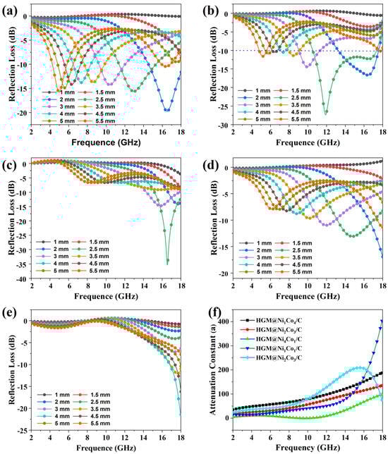 Reflection loss of samples 20 wt.% content: (a) HGM@Ni1Co4/C, (b) HGM@Ni2Co3/C, (c) HGM@Ni1Co1/C, (d) HGM@Ni3Co2/C, (e) HGM@Ni4Co1/C, (f) attenuation constant of HGM@NixCoy/C.