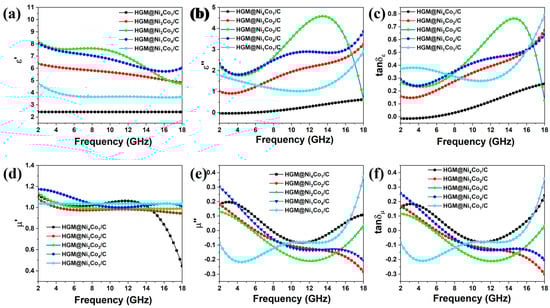 Real part (a) and imaginary part (b) of permittivity, tanδε (c), real part (d) and imaginary part (e) of permeability, tanδμ (f) of HGM@NixCoy/C.