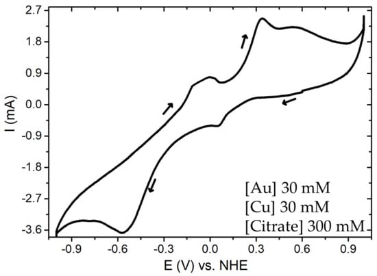 Currently, several formulations exist for copper electrodeposition from citrate-based baths [32], and, to a lesser extent, systems for gold electrodeposition using the same complexing agent have also been described [37]. Figure 1 shows the voltammograms corresponding to the Au-Cu–citrate system. The composition was established based on reference commercial formulations used for the electrodeposition of Cu and 24 kt Au [33,40].