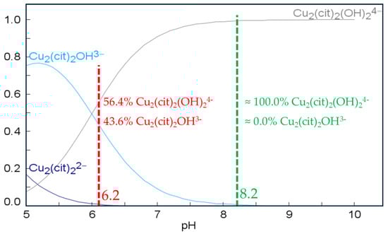 The pH determines the complexes formed by trisodium citrate and thus its effectiveness as a complexing agent for Cu [41]. The speciation analysis of the complexes in solution (Figure 2, with the same concentrations as in Figure 1) confirmed the coexistence of the Cu2(Cit)2OH3 complex (hereafter referred to as monohydroxy) and the Cu2(Cit)2(OH)23− complex (hereafter referred to as dihydroxy) at a preparation pH of 6.1. These two complexes correspond to the two oxidation peaks observed in Figure 1 (and Figure A1a). Neither in the literature nor in the software database used are the Au–citrate complexes listed, which is consistent with the previously discussed observations.
