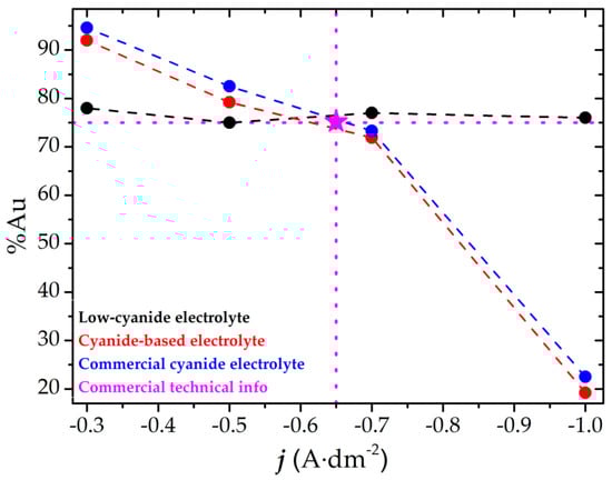 Figure 3 also includes the results obtained using a cyanide-based electrolyte. In this case, a strong dependence on current density was observed, which is considered unfavorable for industrial applications. A similar behavior was noted for the commercial electrolyte, despite the presence of additives. In contrast, the novel low-cyanide electrolyte exhibited significantly improved stability of gold content over a broader current density range, making it a more suitable alternative. Additionally, low-cyanide electrolyte did not require rotation during the laboratory-scale electrodeposition process, unlike cyanide-based electrolyte, where a rotation of 100 rpm was required. This difference reduces the complexity of the electrodeposition process among other advantages.