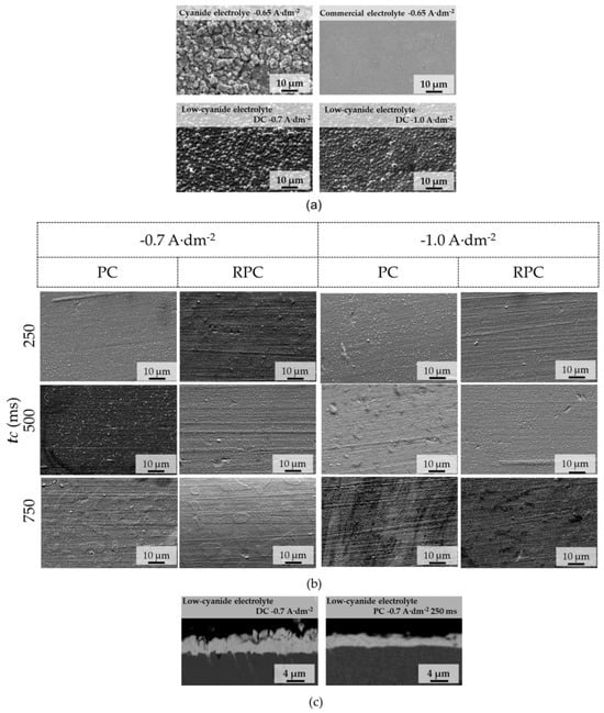 Figure 4. (a) Morphology of the electroplated coatings in DC using the commercial, cyanide, and low-cyanide electrolytes. (b) Morphology of the electroplated coatings by PC and RPC in the case of low-cyanide electrolyte, with a j of −0.7 A·dm−2 and −1.0 A·dm−2, classified by tC. (c) Analysis-example of the thickness of the coatings obtained throughout the study. All analyses were carried out using FESEM.
