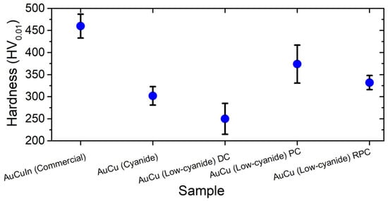Figure 6. Microhardness in Vickers scale of different samples of AuCu alloy from the low-cyanide electrolyte at a current density of −1.0 A·dm−2 and tC of 500 ms in the case of PC and RPC samples, the commercial AuCuIn alloy, and the AuCu alloy from the cyanide-based electrolyte.