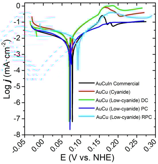 Table 3. Electrochemical corrosion parameters determined for each sample. The samples in the low-cyanide medium were obtained with a j of −1.0 A·dm−2. The AuCu PC and AuCu RPC samples have a tC of 500 ms.