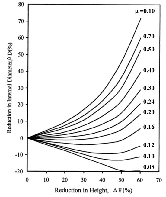 Determination of the friction coefficient: Inner diameters were measured before and after deformation to calculate the diameter change (ΔD). Combining ΔD with the height reduction (ΔH), the friction coefficient (µ) was derived from the standard curve (Figure 2) [24].