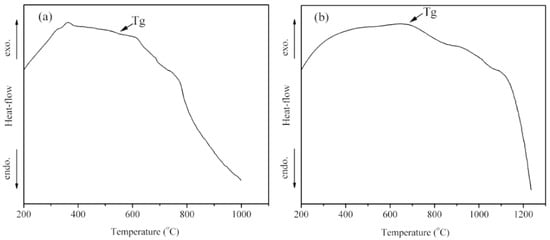 Figure 3. DSC curves of glass: (a) Glass No. 1; (b) Glass No. 2 (The arrows pointed to the glass transition (Tg) temperatures).