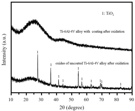 After oxidizing the glass-coated Ti-6Al-4V sample at 950 °C for 1 h, the coating remained fully intact on the substrate without any loss or delamination. The XRD pattern (Figure 5) confirmed the glass coating retained its amorphous structure post-oxidation, with no detectable TiO2 formation. Notably, the coating resisted thermal crystallization even after prolonged holding at 950 °C, critical for forging applications, as crystallization would increase viscosity and degrade lubrication performance.