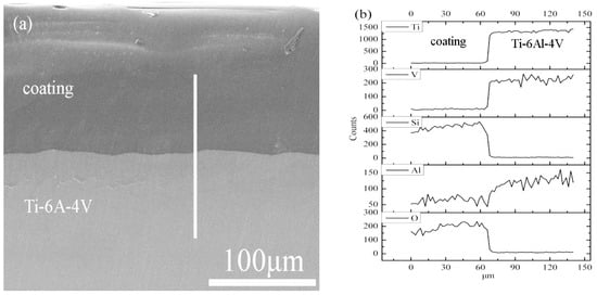 Figure 7 presents cross-sectional SEM images and EDS line scans of the oxidized coating. The microstructure clearly showed the glass coating maintaining robust bonding to the Ti-6Al-4V substrate after oxidation and mechanical preparation. The interface exhibited no pores or cracks, demonstrating strong adhesive integrity. EDS analysis revealed minimal oxygen diffusion into the substrate, with the coating acting as an effective diffusion barrier. Collectively, XRD (amorphous structure), cross-sectional SEM (intact interface), and EDS (limited oxygen penetration) confirm that the composite glass coating provides exceptional high-temperature oxidation protection, leveraging its amorphous morphology and defect-free bonding to suppress oxygen ingress.