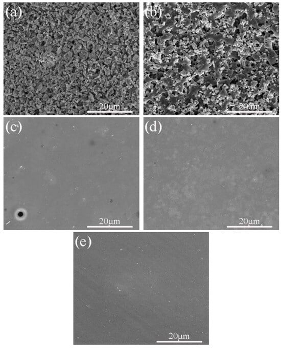 Figure 8. Surface SEM morphologies of glass protective lubricant coating at different temperatures: (a) room temperature; (b) 600 °C, 1 h; (c) 700 °C, 1 h; (d) 800 °C, 1 h; (e) 950 °C, 1 h.