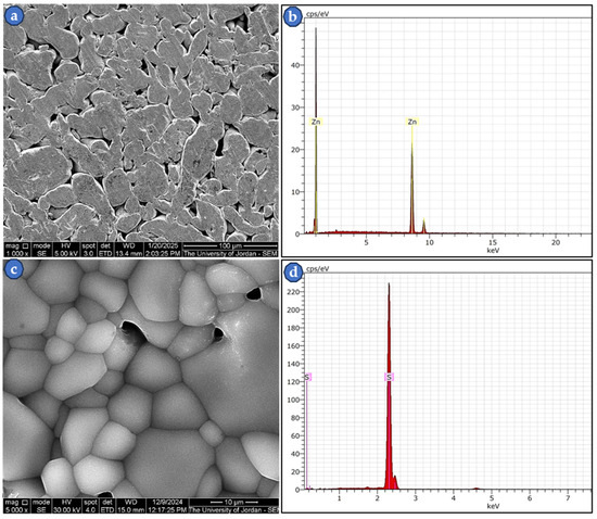 The SEM was vital for studying the microstructure and chemical analysis of the starting materials. Figure 4a–d show the shape, size, and EDS spectra of compacted Zn powder at a pressure of 300 MPa and annealed and compacted S powder at 110 °C for an hour under a vacuum of about 10−3 Torr. A temperature slightly below the melting point of S element (~115 °C) was chosen to ensure a solid sintered pellet of S powder. The S powder was compacted and heat-treated to prepare a flat specimen for easier examination in the SEM. Likewise, Zn powder was also compacted at a pressure of 300 MPa for the same purpose as above. The results show that both starting powders were almost pure, with no impurities, as confirmed using the EDS spectra. This result encourages the production of high-purity compounds, specifically Na2S and ZnS.