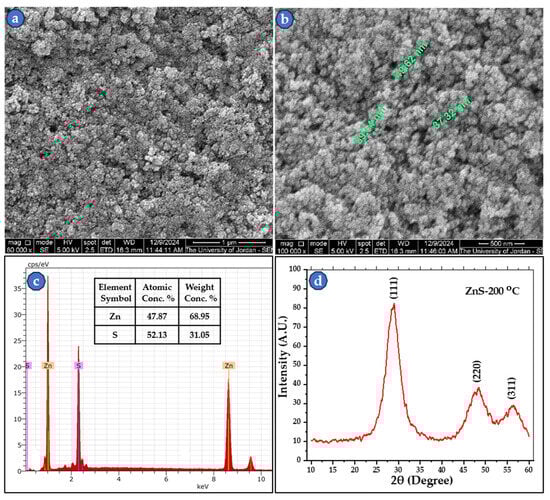 SEM micrographs (SEI-mode) of synthesized ZnS at two high magnifications, (a) 80,000× and (b) 100,000×, with green labeled nanoparticles; (c) EDS spectrum with chemical analysis table; and (d) powder XRD pattern of powder that was annealed at 200 °C.